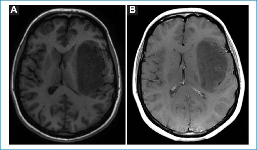 Figura 1. Secuencia ponderada en T1. (A) Masa hipointensa en la región frontoinsular izquierda. (B) No se visualiza realce focal después de administrar contraste paramagnético.