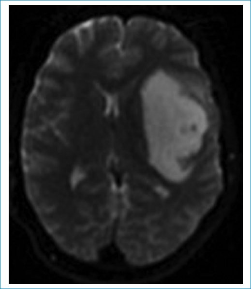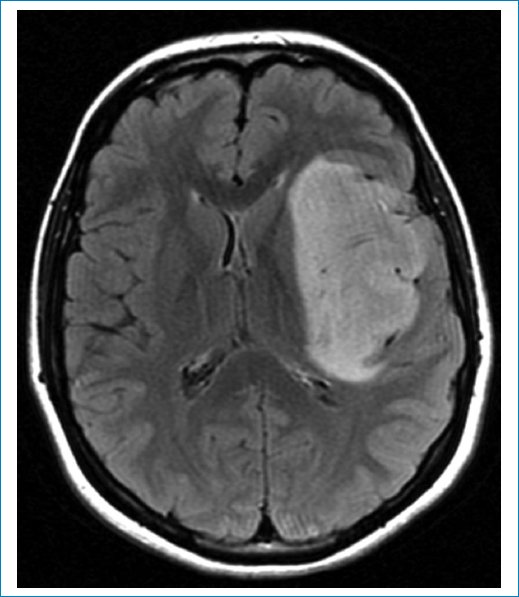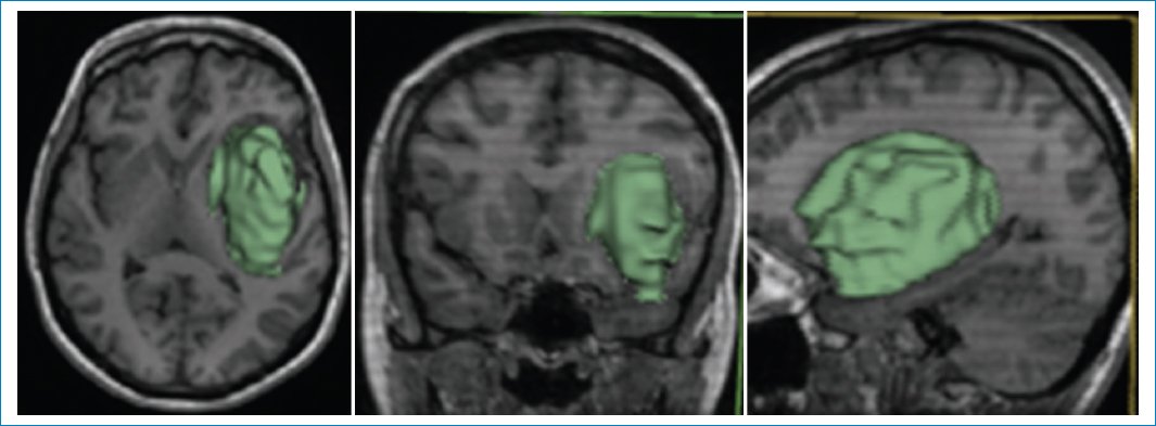 Las imágenes de resonancia magnética (RM) muestran una masa frontoinsular izquierda, hipointensa en la secuencia ponderada en T1 (Fig. 1), hiperintensa en T2 (Fig. 2) e hiperintensa en FLAIR (Fig. 3), pero con centro de menor intensidad. Este hallazgo, llamado “signo de la discrepancia”, es propio de las neoplasias gliales con IDH (isocitrate dehidrogenase) mutado y sin codeleción en 1p/19q1,2, y se observa en los astrocitomas. La codeleción 1p/19q es propia de los oligodendrogliomas3,4. La volumetría indica un volumen de 84 cm3 (Fig. 4).