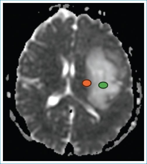Figura 5. ADC = 0,69 × 10–3 mm2/s (en naranja) y 1,75 × 10–3 mm2/s (en verde).