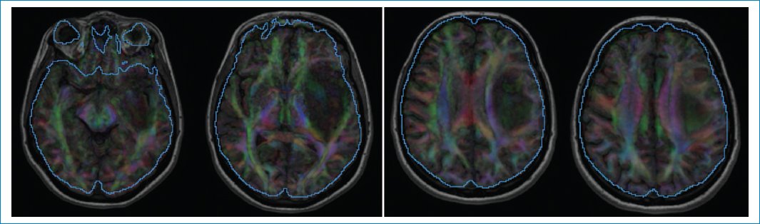 La secuencia de difusión aporta un ADC diferente en la periferia de la neoplasia (0,69 × 10–3 mm2/s) (Fig. 5), que es bajo, indicando mayor celularidad, y es alto en el centro (1,75 × 10–3 mm2/s)5,6. Este último valor refuerza la hipótesis de un IDHm y no codeleción de 1p/19q. Lo mismo ocurre con los valores obtenidos en la medición de la anisotropía fraccional, la difusión paralela y la difusión perpendicular79 (Fig. 6).
