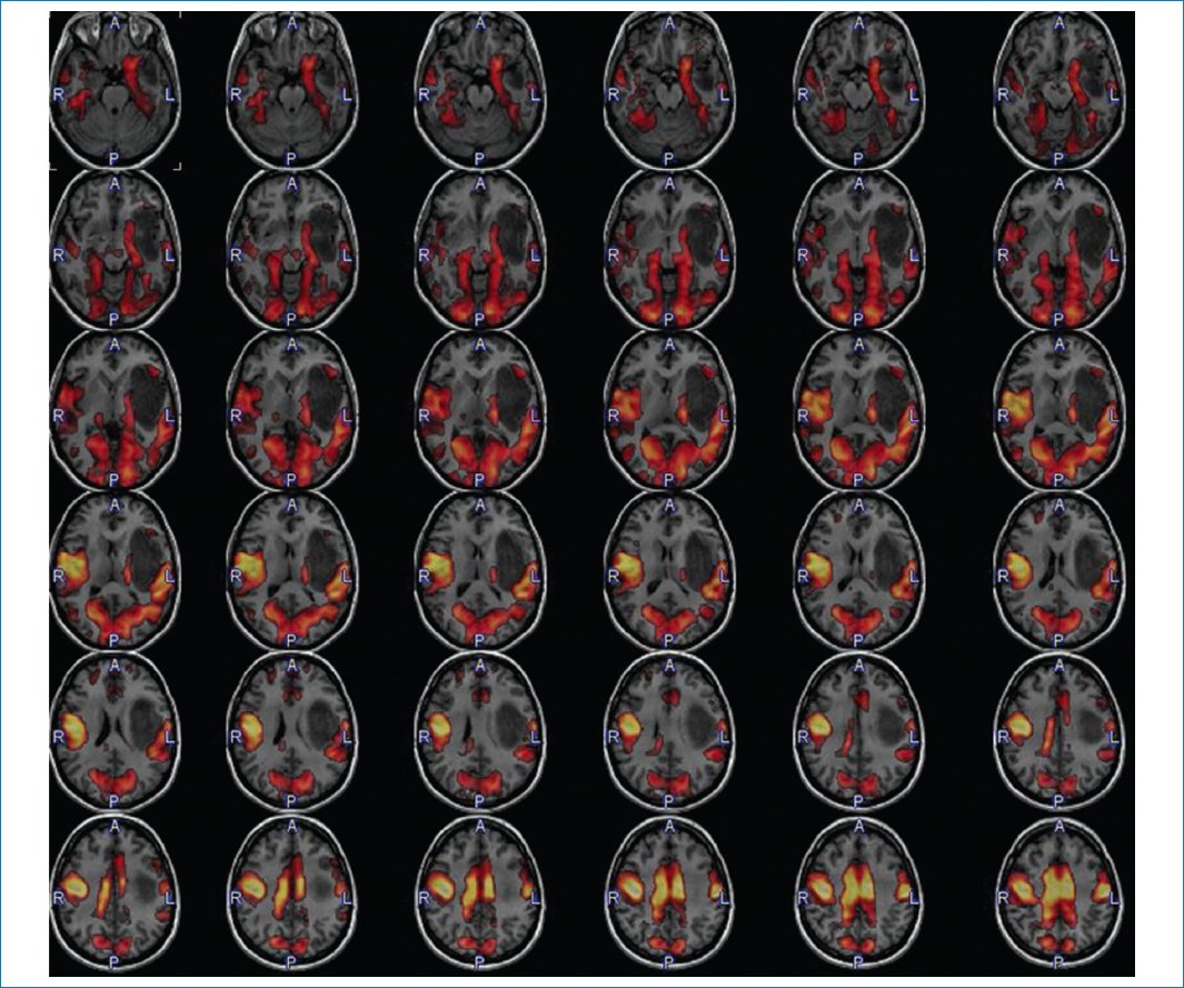 Los síntomas de la paciente pueden ser correlacionados con su lesión extendida al área central izquierda, lo cual es muy bien graficado en el estudio de RM en estado de reposo11,12 (Fig. 8).