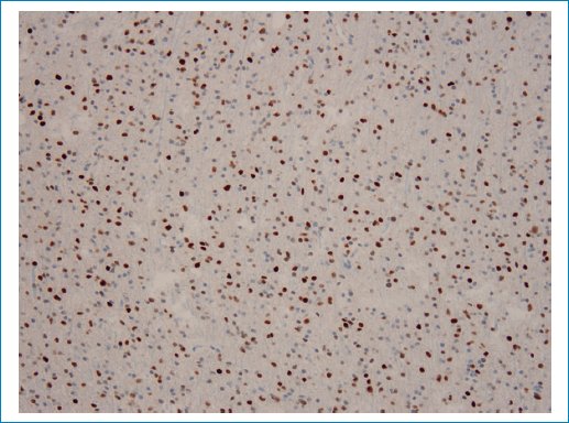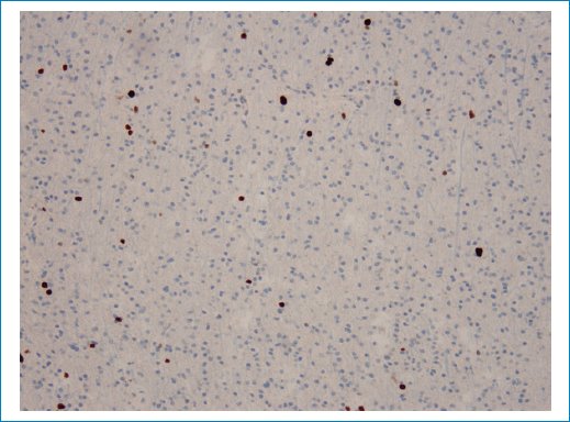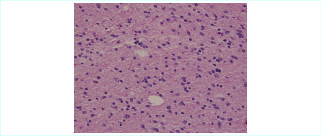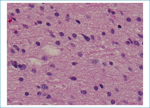 Figura 9. La imagen de aumento medio de las secciones teñidas con hematoxilina y eosina muestra un aumento moderado de la celularidad debido a la presencia de una neoplasia glial infiltrante difusa con núcleos ovalados a redondos ligeramente agrandados. No se observan figuras mitóticas, proliferación microvascular ni necrosis.