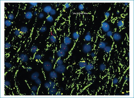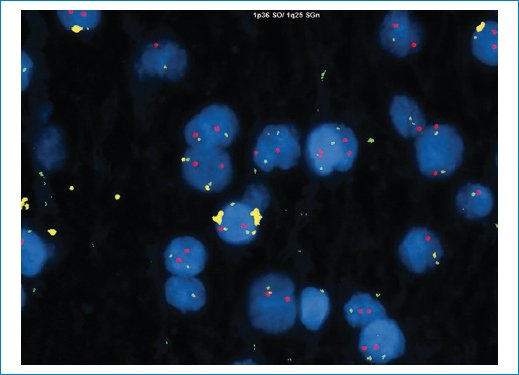 Figura 13. La hibridación fluorescente in situ es negativa para la pérdida concurrente de 1p/19q, que sería típica de una neoplasia oligodendroglial.