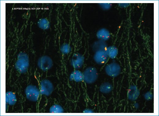 Figura 15. La hibridación fluorescente in situ es negativa para las alteraciones del número de copias del cromosoma 10 y pérdida de PTEN.