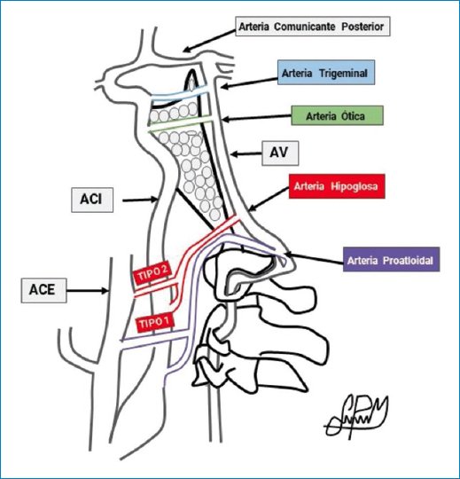 Figura 1. Esquema de las comunicaciones carotidovertebrobasilares. Se representa la conexión entre la circulación anterior y la circulación posterior, a través de las arterias intersegmentarias. En orden cefalocaudal se encuentran la arteria trigeminal (celeste), la arteria ótica (verde), la arteria hipoglosa (roja) y la arteria proatloidea (violeta). Se grafican las variantes de estas dos últimas: el tipo 1 nace de la ACI y el tipo 2 que nace de la ACE.