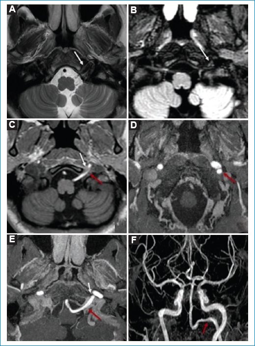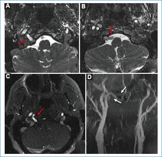 Las secuencias convencionales ponderadas en T2 y FLAIR (fluid attenuated inversion recovery), y las secuencias volumétricas T1 y ARM 3D TOF (time of flight) con inyección de gadolinio (Gd), mostraron una estructura de origen vascular que ingresaba al endocráneo a través del agujero condíleo anterior (conducto hipogloso) y se dirigía en sentido posterior para unirse al tronco basilar (TB). Se confirmó que dicho hallazgo correspondía a una arteria anómala del cuello que se unía al TB, asociada a hipoplasia de las arterias vertebrales (AV) (Fig. 2).