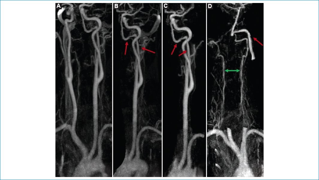 Figura 3. ARM de troncos supraaórticos con Gd (A). Se observa la arteria hipoglosa naciendo de la ACE (tipo 2), con un trayecto ascendente (flechas rojas) adyacente a la ACI y conformando el TB (B y C). Las AV hipoplásicas contribuyen a formar el TB (flecha doble verde [D]).