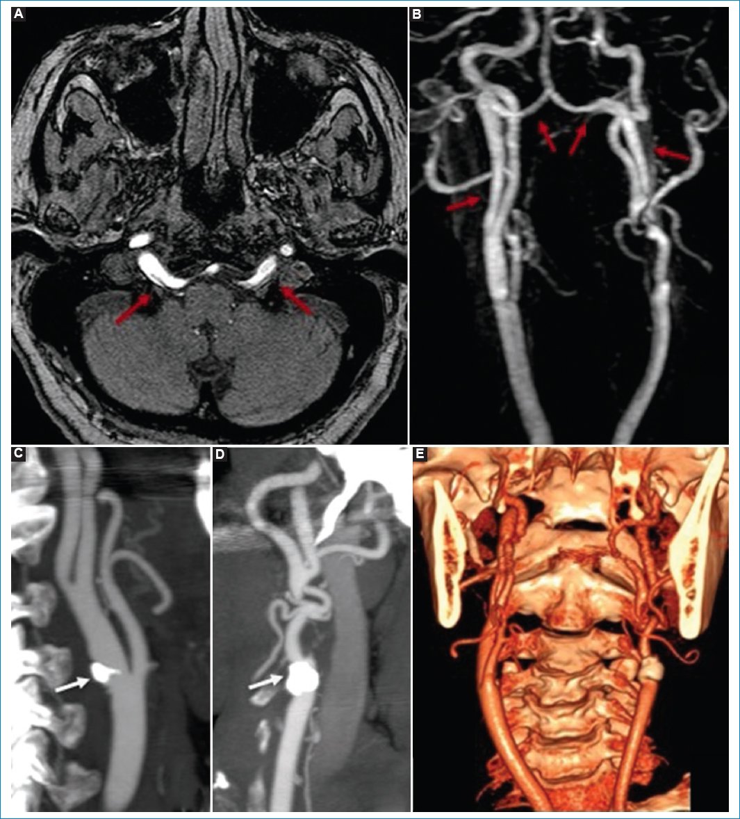 Figura 5. Secuencia de ARM 3D TOF en el plano axial (A) y reconstrucción 3D MIP de vasos cervicales e intracraneales (B), angiografía por TC con reconstrucción MIP de los vasos cervicales derecho (C) e izquierdo (D), y angiografía por TC con reconstrucción 3D de los vasos cervicales (E). Se observan las arterias hipoglosas bilaterales (flechas rojas) emergiendo en el tercio medio del segmento cervical de la ACI (tipo 1) e ingresando en la fosa posterior a través del canal hipogloso, formando el TB y dando origen a la circulación posterior. Se nota agenesia de las AV bilaterales. Destaca la ateromatosis de los sistemas carotídeos cervicales bilaterales (flechas blancas).