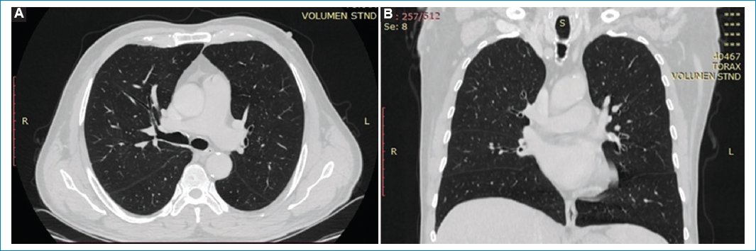 Figura 1. TC de tórax en ventana para evaluar parénquima pulmonar, (A) corte axial y (B) corte coronal. No se identifican particularidades en el pulmón.