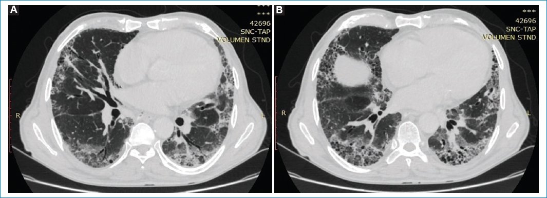 Figura 2. (A y B) TC corte axial en ventana para evaluar parénquima pulmonar, “patrón en panal de abejas” en ambos lóbulos inferiores. Se acompaña de bronquiectasias cilíndricas en ambos parénquimas.