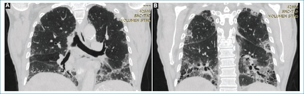 Figura 3. (A, B) TC corte coronal en ventana para evaluar parénquima pulmonar, “patrón en panal de abejas” en ambos lóbulos inferiores. Se acompaña de bronquiectasias cilíndricas en ambos parénquimas.