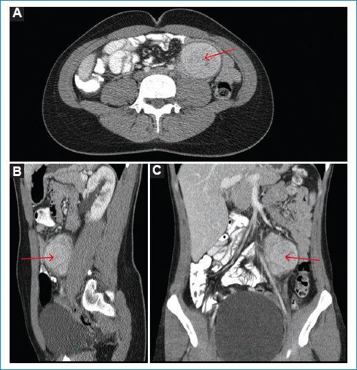 Figura 1. TC de abdomen con contraste en fase venosa en plano axial (A), sagital (B) y coronal (C). Se observa una masa redonda, retroperitoneal, paraaórtica izquierda (flechas rojas), que mide 8 × 5.6 × 4.6 cm, adyacente al músculo psoas, con realce homogéneo con el medio de contraste, sin calcificaciones ni zonas de necrosis. No hay invasión de las estructuras adyacentes.