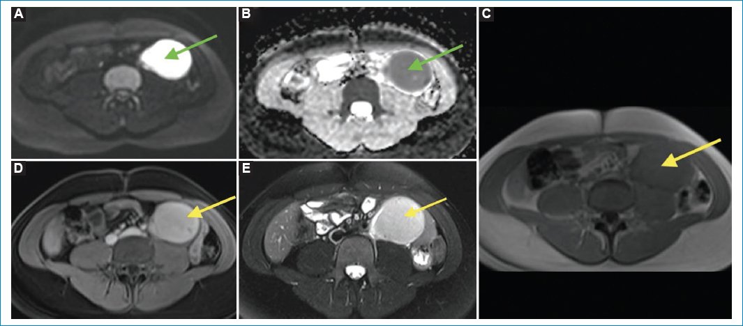 Figura 2. RM contrastada en secuencias DWI (A) y mapa ADC (B), T1 pre- y posgadolinio (C y D), y T2 con saturación grasa (E). La masa retroperitoneal tiene intensidad de señal homogénea, es hiperintensa en las secuencias ponderadas en T2 (E, flecha amarilla) e isointensa al músculo en las secuencias ponderadas en T1 precontraste con realce homogéneo con el gadolinio (C y D, flechas amarillas), y presenta marcada restricción de la difusión (A y B, flechas verdes).
