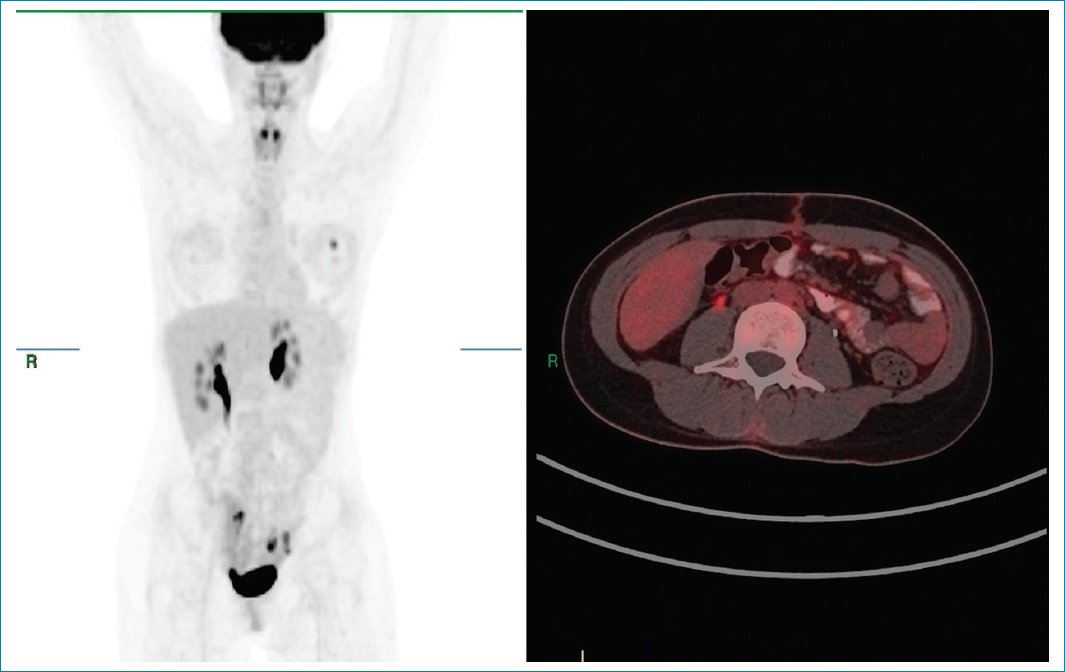 Figura 3. PET-TC con 18F-FDG. Desaparece la masa retroperitoneal izquierda por la resección quirúrgica, sin encontrar focos de aumento anormal del metabolismo glucídico. Se descarta enfermedad multicéntrica.