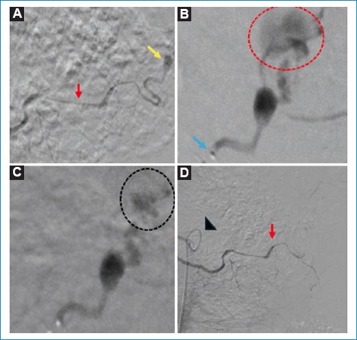 Figura 1. Tratamiento endovascular con cateterismo del tronco celíaco (A), donde se observa vasoespasmo difuso de la arteria esplénica (flecha roja) con pseudoaneurisma distal (flecha amarilla). Se realizó microcateterismo selectivo (B) y desde el microcatéter (flecha azul) se observó extravasación de contraste (círculo rojo punteado). Al realizar la oclusión con NBCA (C) se observó extravasación de NBCA fuera de la luz arterial (círculo negro punteado). En el control final (D) no hubo evidencia de sangrado activo.