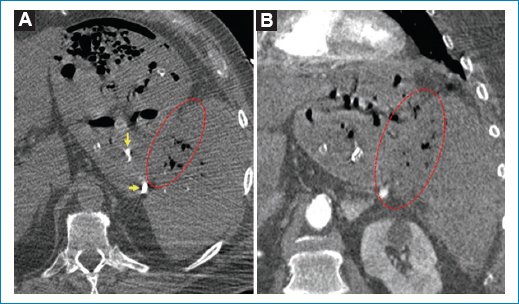 Figura 2. TC axial (A) y coronal (B) posterior a la estabilización del paciente. Se observa la pérdida de planos de separación entre el estómago y el bazo, con imágenes similares al contenido gástrico en los tejidos periesplénicos y el bazo (círculo rojo punteado). Se constata material de embolización en la cavidad gástrica (flechas amarillas).