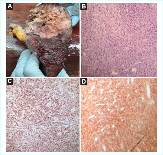 Figura 3. (A) Pieza quirúrgica en la que se evidencia un tumor macroscópico del bazo. (B) Imagen de histología con tinción de hematoxilina y eosina. Se observa una proliferación linfoide de células grandes. (C) Técnica de inmunohistoquímica: ki67 muestra un alto índice de proliferación celular. (D) Técnica de inmunohistoquímica: CD20 positivo, indicando proliferación linfoide.
