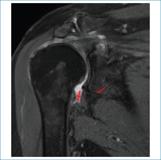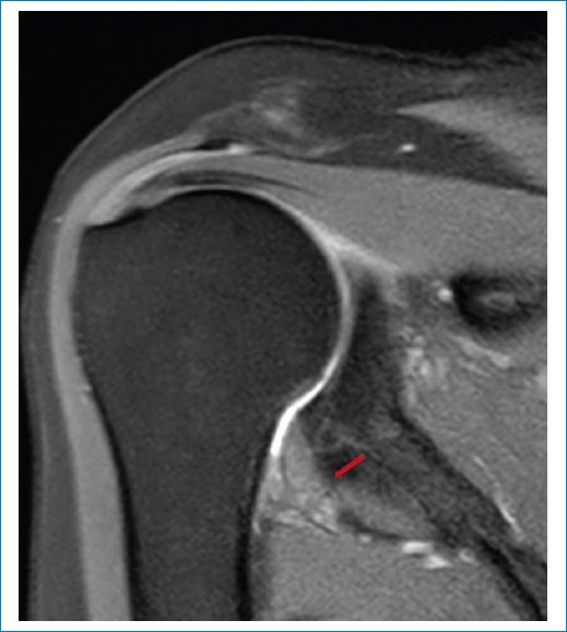 Figura 1. RM en secuencia DP-FS, corte coronal. Se observa un engrosamiento del ligamento glenohumeral inferior con señal hiperintensa en el receso axilar (flecha).