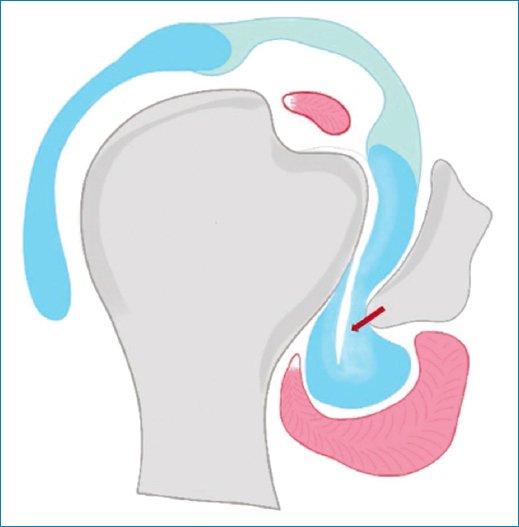 Figura 2. Ilustración de un corte coronal mostrando engrosamiento capsular del receso axilar (flecha).
