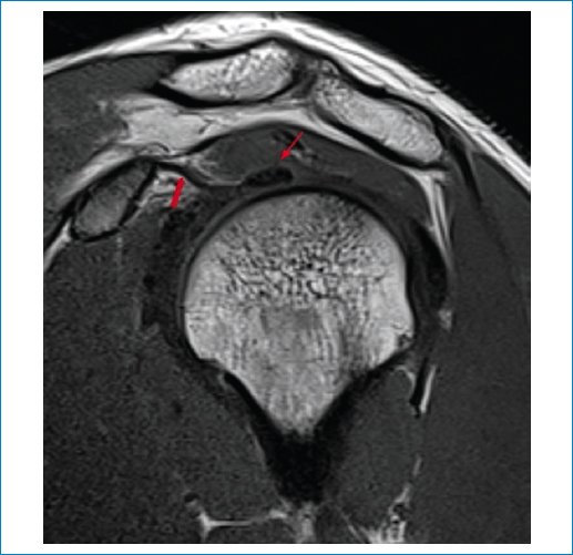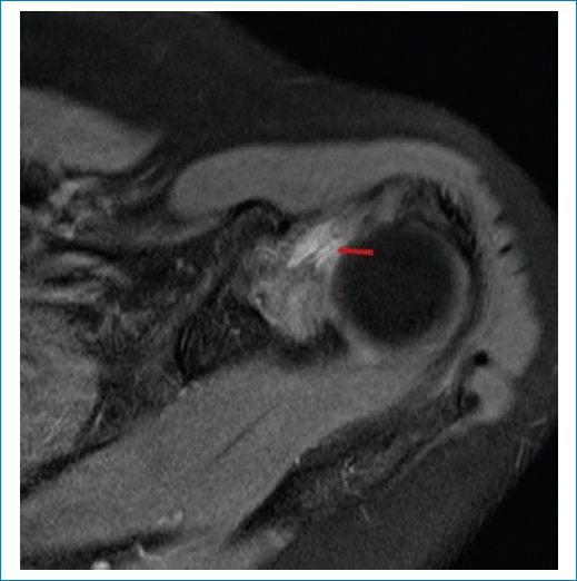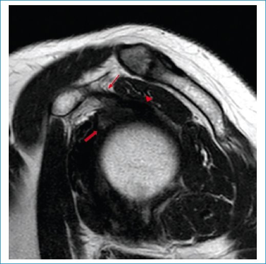 Figura 5. RM en secuencia potenciada en T2, corte sagital. Se observan obliteración parcial del intervalo rotador (flecha gruesa), engrosamiento del ligamento coracohumeral (flecha fina) y bíceps braquial (punta de flecha).