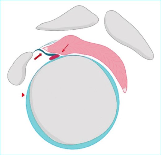 Figura 6. Ilustración de un corte sagital que muestra el ligamento coracohumeral (flecha gruesa), la cápsula articular (punta de flecha) y el tendón del bíceps braquial (flecha fina).