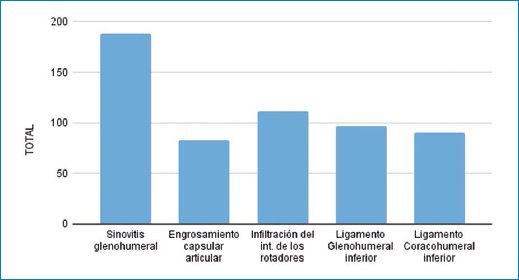 Figura 9. Distribución de los hallazgos radiológicos en la RMH en pacientes con signos tempranos de CA (n = 240): sinovitis glenohumeral en 188 casos (78%), infiltración grasa en el intervalo de los rotadores en 112 casos (46%), engrosamiento capsular-articular en 83 casos (34%), engrosamiento del ligamento glenohumeral inferior en 97 casos (40%) y engrosamiento del ligamento coracohumeral en 4 casos (1,6%).