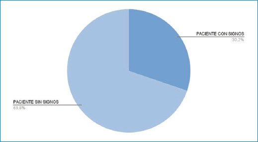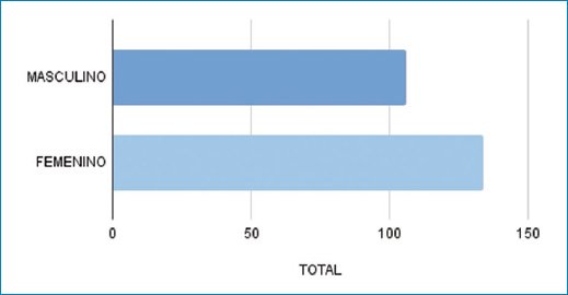 Figura 11. Distribución por sexo de los 240 pacientes con signos tempranos de CA. Hubo una mayor prevalencia en las mujeres, con 134 casos (55%), frente a 106 en los varones (44%).
