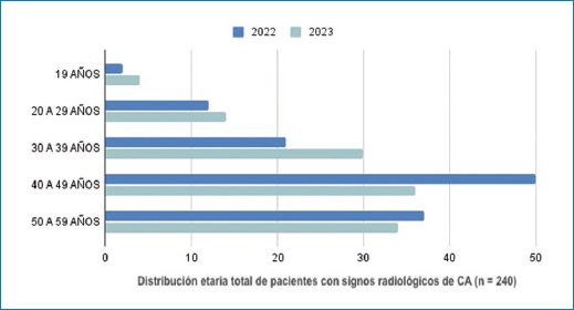 Figura 12. Distribución etaria de los 240 pacientes con signos tempranos de CA. Se observó una mayor frecuencia en el grupo de 40 a 49 años.