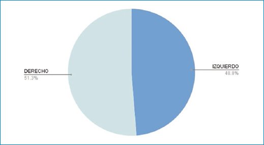 Figura 13. Lateralidad del compromiso del hombro en pacientes con signos radiológicos de CA. Hubo compromiso derecho en 123 pacientes (51%) e izquierdo en 117 (48%). Dado que las frecuencias son similares, no se evidencian diferencias clínicamente significativas.