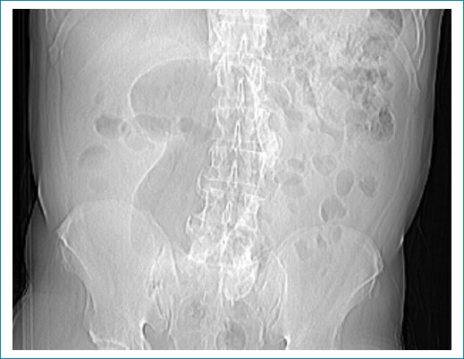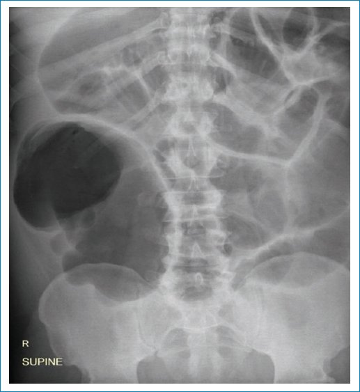 Figura 1. Radiografía de abdomen de paciente masculino de 47 años con dolor abdominal de tipo cólico de 5 días de evolución, que asocia náuseas, sin otros síntomas de jerarquía. Se observa el signo del embrión cecal en fosa ilíaca derecha, de aspecto “segmentado” por las haustras colónicas (tomada de Wismayer R4).