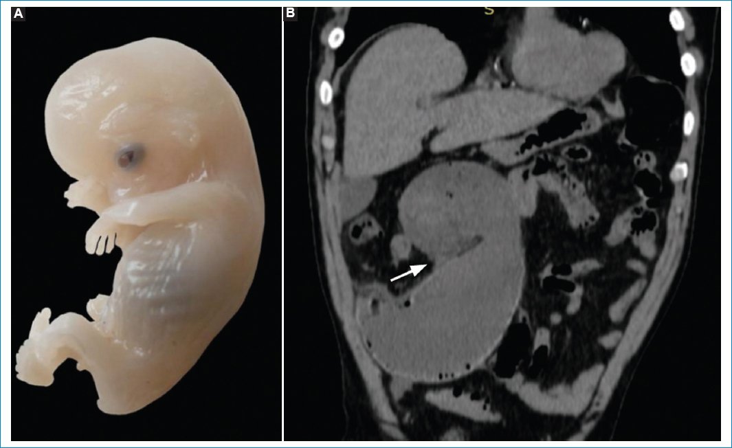 Figura 2. (A) Embrión humano de 8-9 semanas de gestación (imagen tomada de Wikimedia Commons, usuario Anatomist90, disponible en: https://commons.wikimedia.org/wiki/File:Human_embryo.jpg, bajo licencia CC BY-SA 4.0, con autorización). (B) TC abdominal con reconstrucción en plano coronal de paciente masculino de 67 años que acude a nuestra institución con dolor en fosa ilíaca derecha de 4 horas de evolución, sin otros síntomas acompañantes. Se evidencia al ciego distendido y volvulado con punto de torsión en válvula ileocecal (flecha blanca), e incipientes signos de neumatosis parietal.